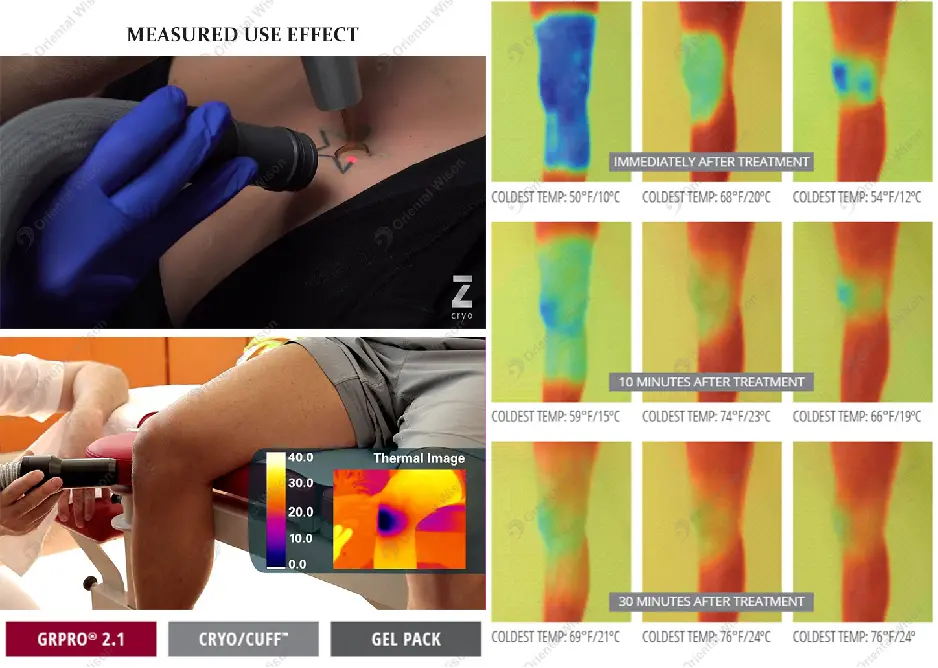 접촉 냉각, 극저온 스프레이 또는 아이스 팩과 같은 다른 냉각 방법과 달리, 냉동 냉각 기계는 피부 온도를 더 빨리 감소시키고 피부 화상의 위험이 줄어들고 전체 처리 시간에 걸쳐 일정한 복용량을 유지합니다.