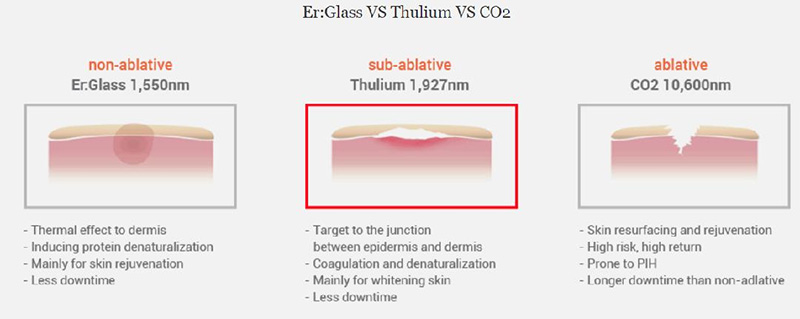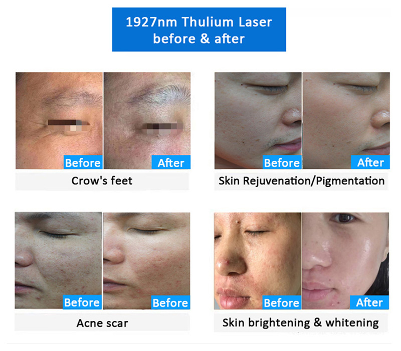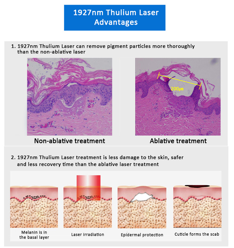 또한, 1927nm 툴륨 레이저는 시술 중에 동시에 조절 가능한 에너지 강도 및 펄스 지속 시간에 의해 멜라 스마, 색소 병변, 주름, 큰 기공 등을 치료하는 훌륭한 방법입니다. 표피 기저층에서 색소 침착을 치료하기 위해, 흉골 레이저 시스템으로부터 의이 하위 절제는 표피 기저층에 많은 멜라닌 세포 및 멜라닌이 있기 때문에 가장 좋은 증거가 될 것이다.